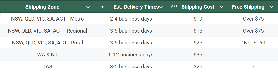 Please see below our shipping policy for Australia - if you have any questions please send us a message.